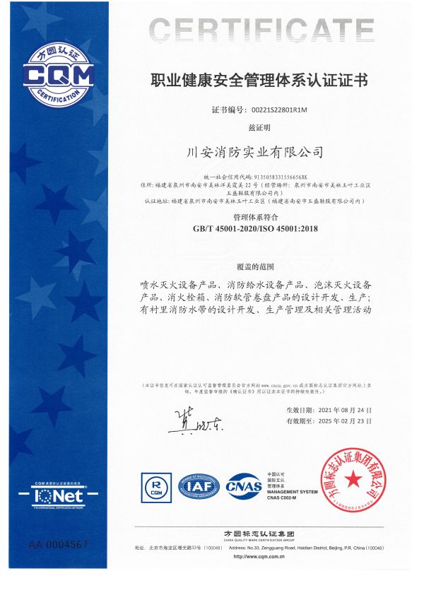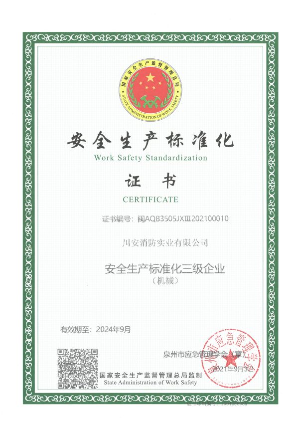風雨歷程,銳意進取,敢為人先。川安消防實業(yè)有限公司創(chuàng)建于2012年,位于福建東南沿海著名僑鄉(xiāng)泉州市南安,是一家集”研發(fā)、生產(chǎn)、銷售、服務”為一體的消防設備產(chǎn)品專業(yè)生產(chǎn)企業(yè),以“用產(chǎn)品和服務為用戶創(chuàng)造價值”的經(jīng)營理念,公司緊跟先進制造和檢測技術(shù)發(fā)展方向,不斷開展技術(shù)創(chuàng)新,追求高質(zhì)量品質(zhì)、為客戶提供優(yōu)質(zhì)的產(chǎn)品和服務。